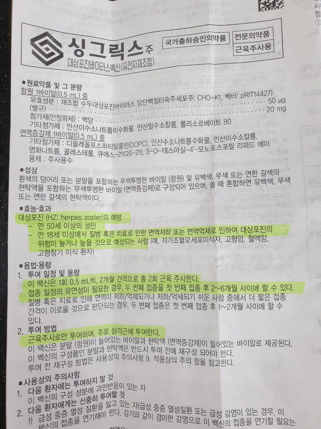 [싱그릭스] 접종 대상자는 만 50세 이상의 성인과 만 18세 이상에서 질병 혹은 치료로 인한 면역저하 또는 면역억제제로 인하여 대상포진의 위험성이 높거나 높을 것으로 예상되는 경우입니다.