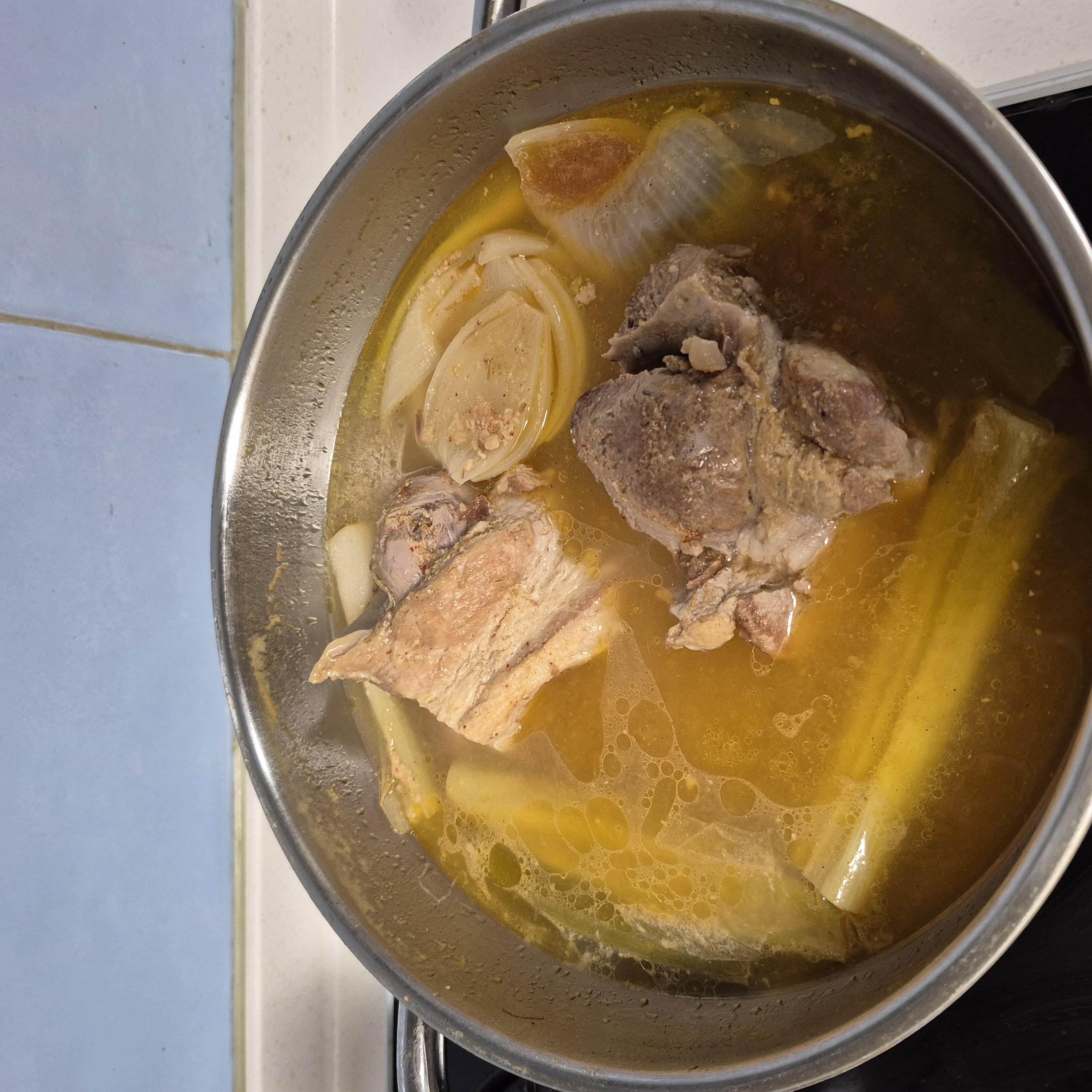 뚜껑을 덮은 채로 1시간 동안 천천히 끓여주어야 고기가 속까지 잘 익습니다.