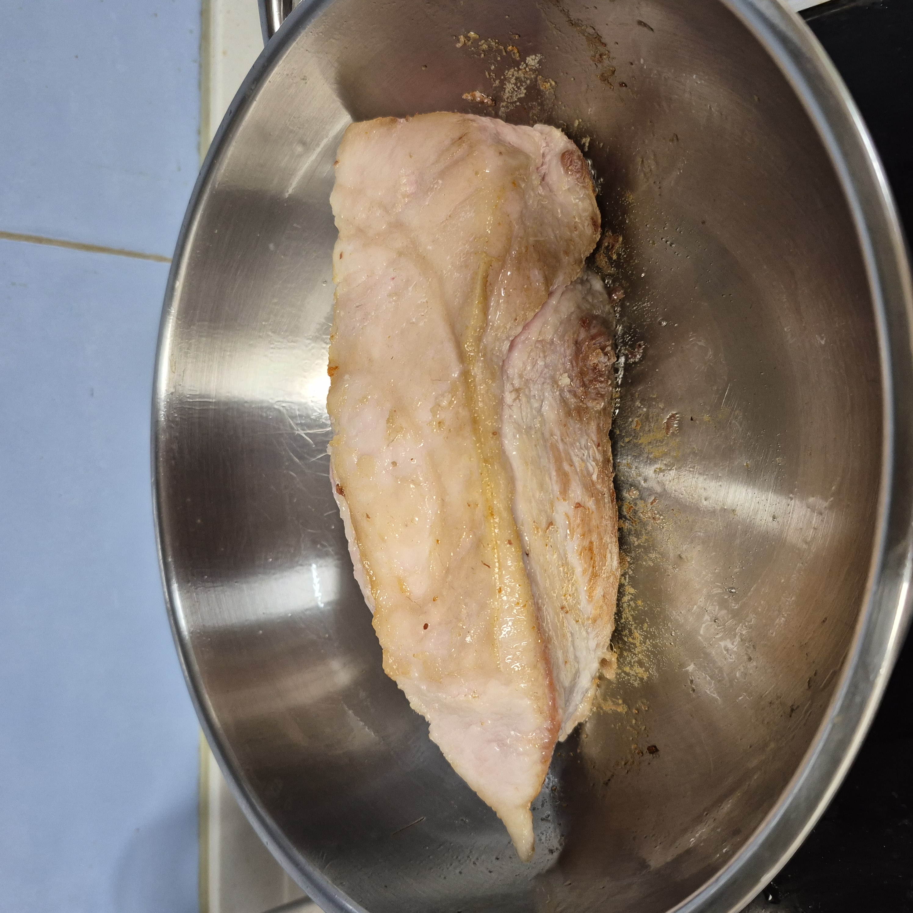 고기가 너무 크기 때문에 반을 잘라 삶아야 빨리 잘 익을 수 있습니다.