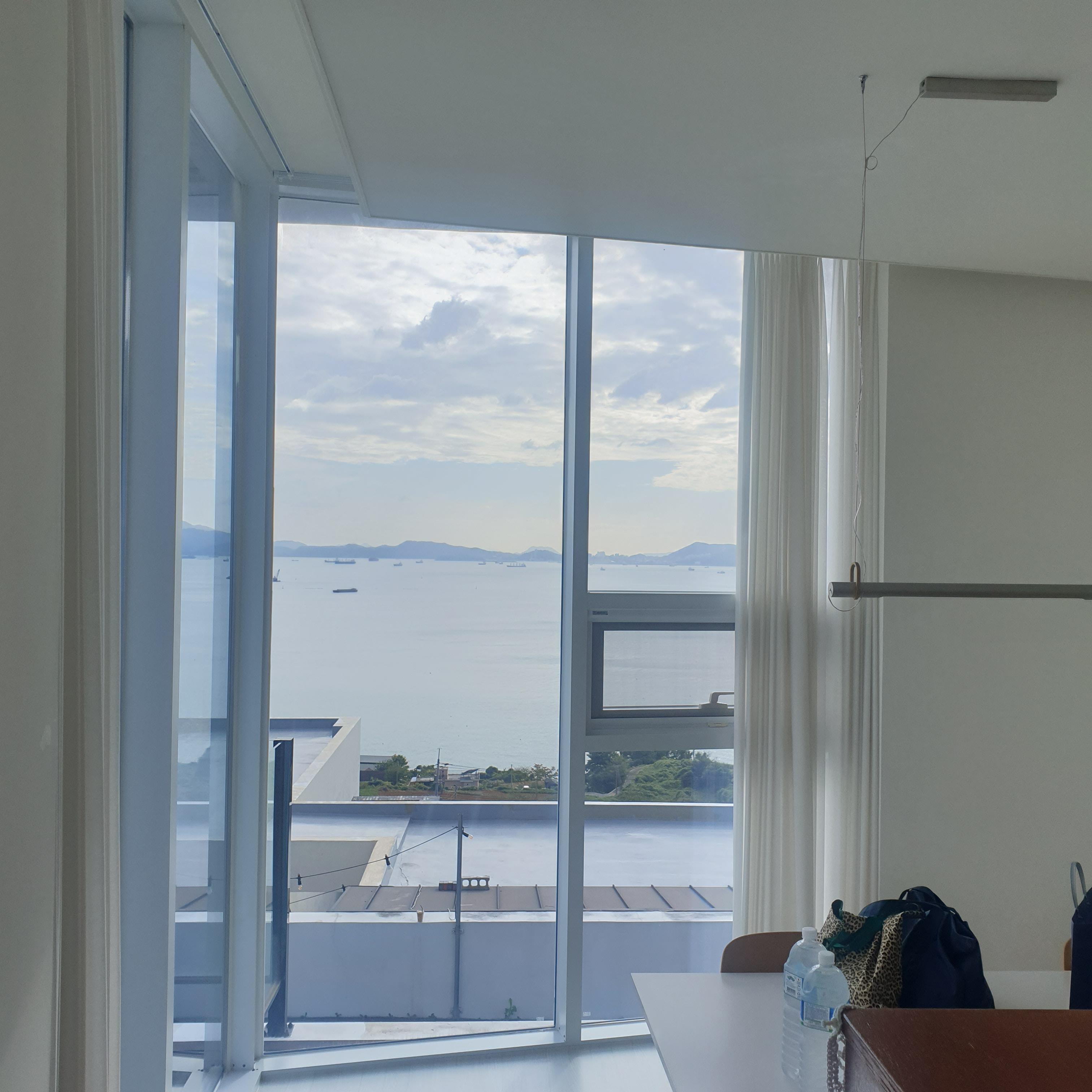 문을 열고 들어선 순간 감탄사가 절로 나옵니다. 아담한 거실에서 바라본 확 트인 바다와 이쁜 하늘.