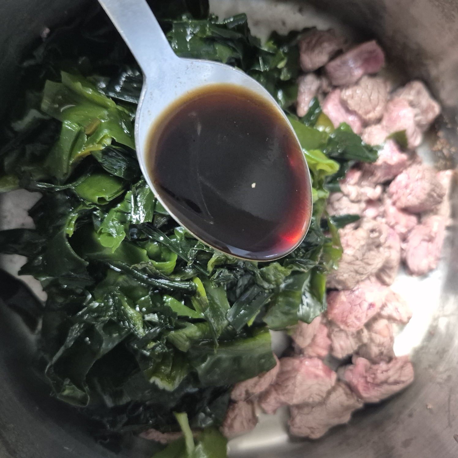 - 소고기가 어느 정도 익으면 미역과 국간장 1스푼, 참기름 1스푼을 넣고 계속 중불에서 살짝 볶습니다.