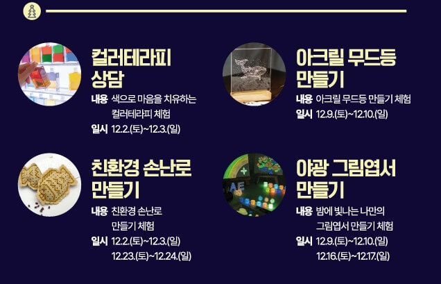 해운대 지하철에서 내려 백사장까지 이어져 있는 구남로와 그 주변 해운대 시장길, 온천길 등에서 행사와 먹거리 등 재미있는 체험을 할 수 있습니다. 특히 중심길인 구남로에서는 대형 빛 크리스마스트리와 신년 소원 비는 곳과 더불어 크리스마스트리 만들기와 친환경 손난로 만들기 등 각종 체험 프로그램도 있으니 어린 자녀들과 함께해도 좋을 것 같습니다. 가격은 무료에서부터 5000원 내외 정도입니다.