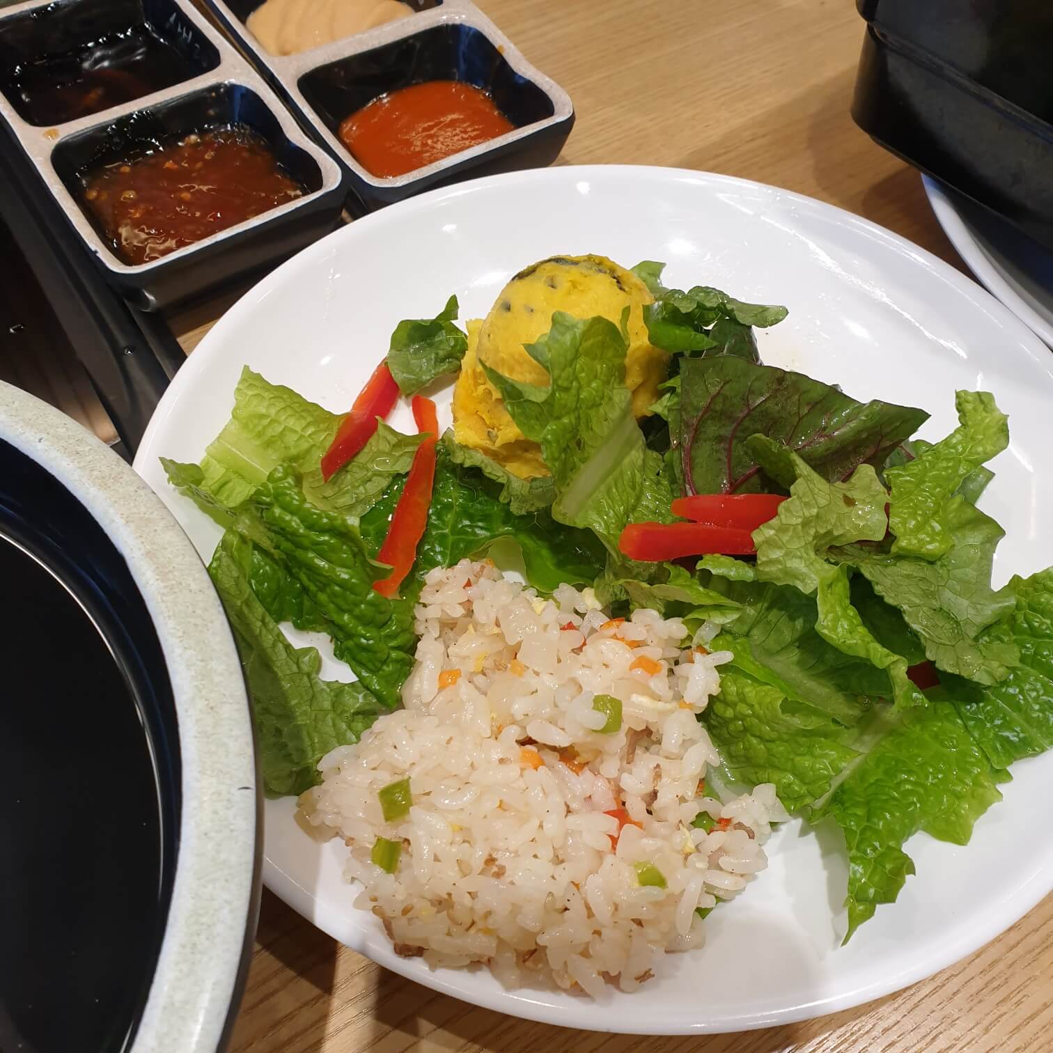 다소 이상한 궁합입니다. 볶음밥과 야채, 호박 샐러드....