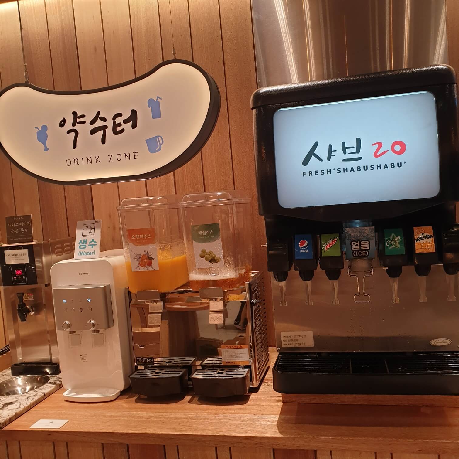 생수와 오렌지, 매실 주스 그리고 각종 탄산음료과 얼음을 중심을 펼쳐져 있습니다.