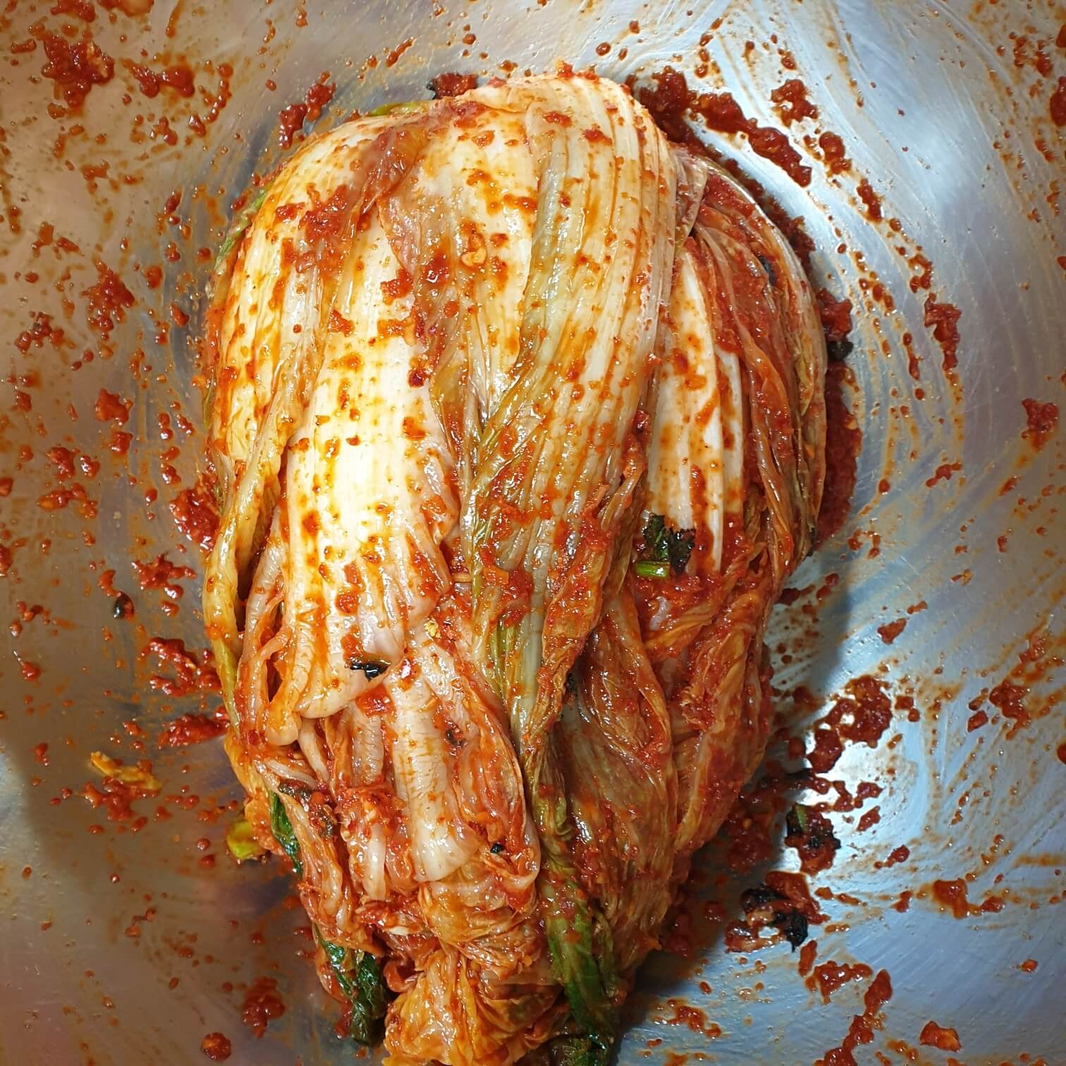 양념의 묽기는 약간 질퍽한 정도입니다. 남편과 저는 각자 큰 스텐볼에 배추를 하나씩 넣어서 양념을 버무리니 딱 적당했습니다.