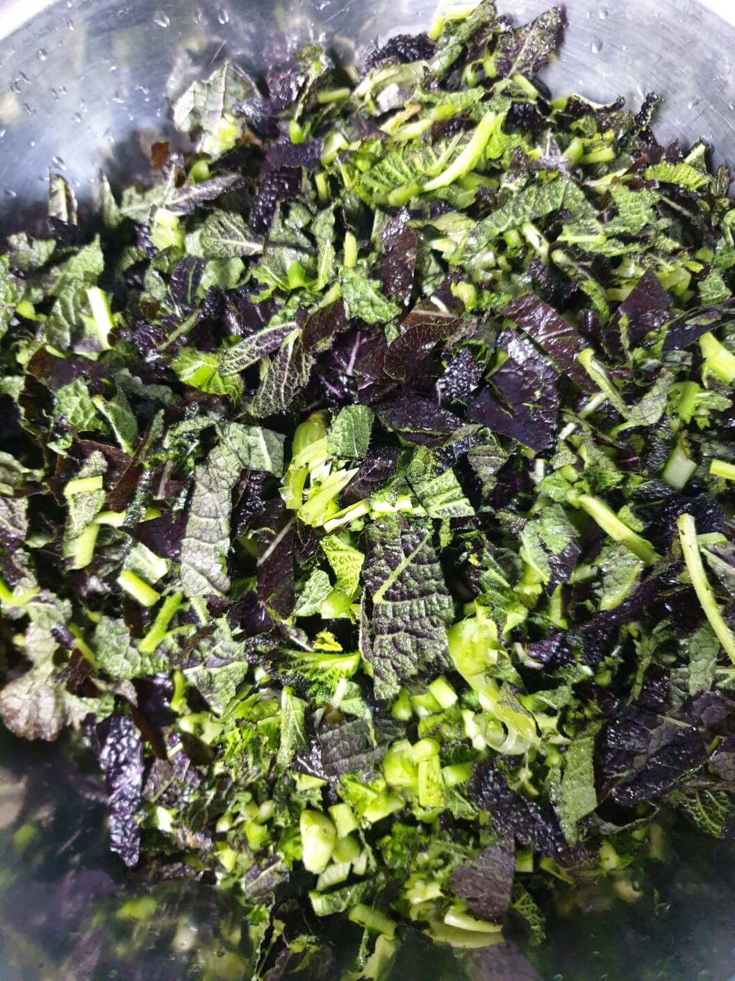 다음은 홍갓이랑 잔파를 다듬어 씻어 청각과 함께 쫑쫑 (저는 아주 짧게!!) 썰어 줍니다. 김치가 완성되었을 때 최대한 깔끔한 모양이 되도록 하기 위해서입니다.
